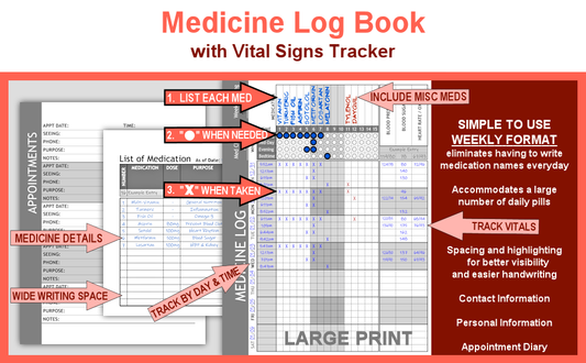 Medicine Log Book with Vital Sign Tracker: 1-Year Log Book, High Pill Capacity, Daily Tracking