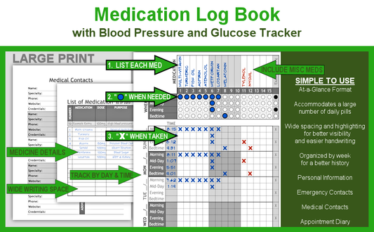 Medication Log Book with Blood Pressure and Glucose Tracker: 1-Year, Daily Tracking, High Pill Capacity, Large Print