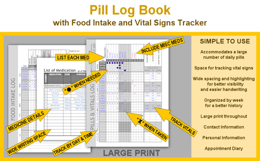 Pill Log with Food Intake and Vital Signs: Daily Tracking, High Pill Capacity, Large Print